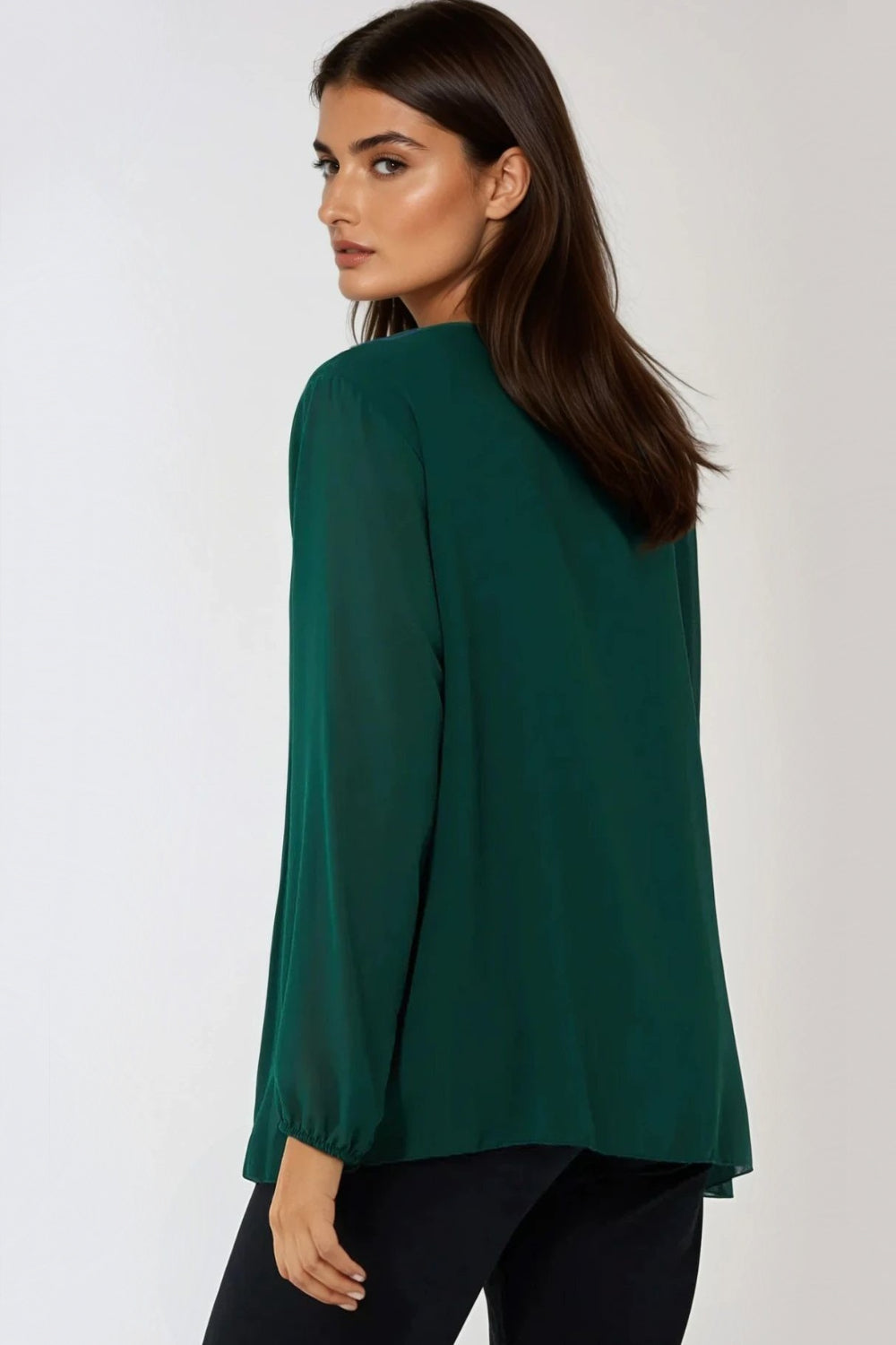 Elevate your wardrobe with the Aftershock London Pleated Long Sleeve Blouse in stunning green. This stunning piece features a pleated design that adds texture and sophistication, complemented by its soft viscose lining for ultimate comfort. The long sleeves offer elegance while the round neckline provides a flattering silhouette.